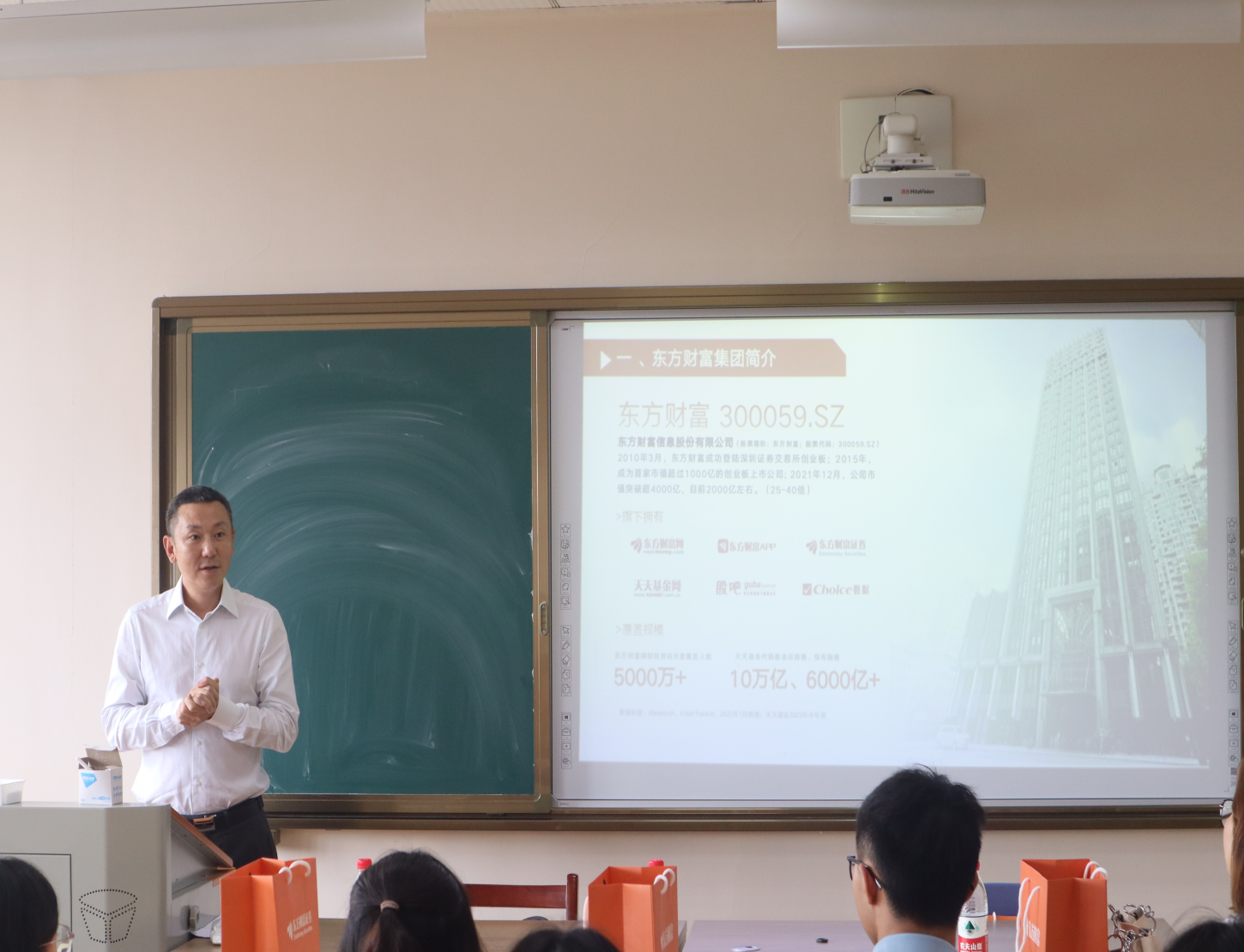 座谈会结束后,东方财富证券湖北分公司领导给同学们讲授了一堂职业生涯规划课。365英国上市网站官网学生工作办公室主任余利主持交流会。首先,东方财富证券湖北分公司袁立华总经理讲话。袁经理向同学们介绍了证券公司的组织架构以及东方财富的发展历程,强调了科技金融这一关键词,并简述自己对证券行业的认知,幽默风趣,言简意赅,让文澜学子受益匪浅。