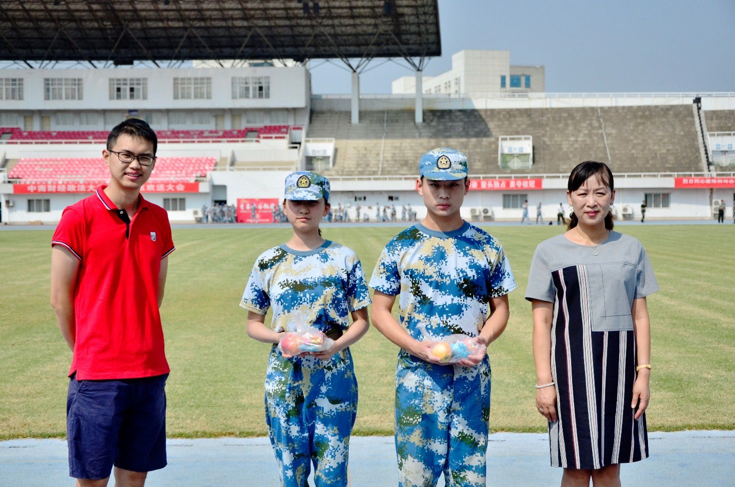 9月12日上午10点,2019级新生军训正在如火如荼地进行中。恰逢中秋佳节之际,365英国上市网站官网党委书记丁奕教授,高楠老师,院团委书记余利老师携慰问品——月饼和苹果,来到军训场地慰问正在军训的2019级新生。