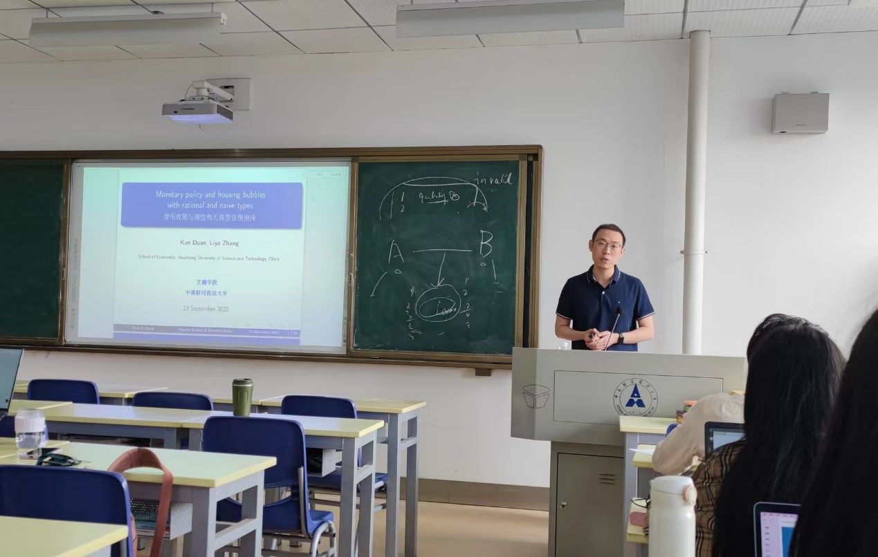2022年09月23日,华中科技大学经济学院段堃助理教授受邀为365英国官网开展学术讲座。本次讲座讨论货币政策是否以及如何影响中国不同类型的房地产泡沫,本次讲座由帅杰、宋天乐老师主持,365英国上市网站官网21级全体硕士生及众多师生听取了本次讲座。