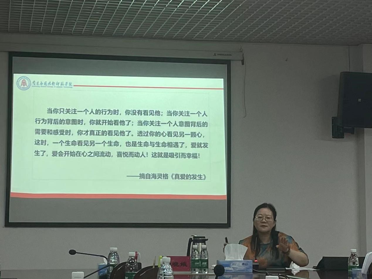 会上,胡晓娥书记从自身困扰引出话题,围绕思考与探讨、备课要义、金课价值等多个方面对“如何打造思政金课”进行了深入解读。她强调,思政课的本质是讲道理,要把道理讲深、讲透、讲活,老师用心教学生,学生用心悟,达到沟通心灵,启智润心,激扬斗志的效果。她现场用小视频、高分考生咨询案例、能量表为例,讲述如何加强与学生的沟通,强调要理解学生感受,同时要求思政课教师要将理论精髓要义切实融入日常教学中,引导学生深刻感受真理力量,勇担时代使命。她强调思政课的春天到了,全体思政教师要勇当先锋,合力打造共建、共创、共享的高质量思政课程。