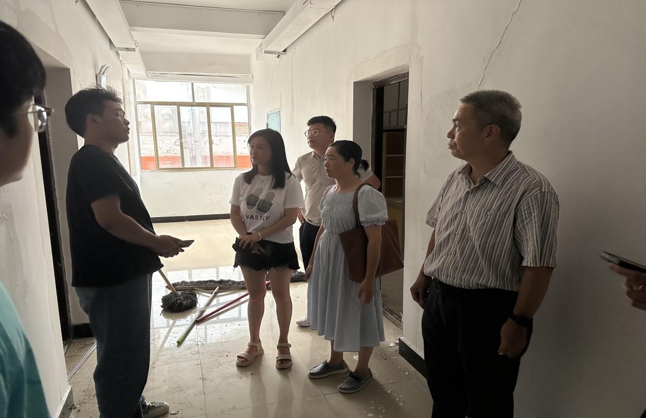 为贯彻落实习近平新时代中国特色社会主义主题教育走深走实,确保新生开学前学生公寓修缮工作顺利完成,8月22日下午,党总支书记张欣康,院长文道贵,党总支副书记李婷,副院长张丹一行深入27、28栋学生公寓施工现场,察看学生公寓暑期维修改造进展情况,党政办公室、学生科相关人员参加检查。