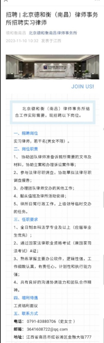 ㈠ 北京德和衡(南昌)律师事务所结合工作实际需要,现招聘以下岗位。
