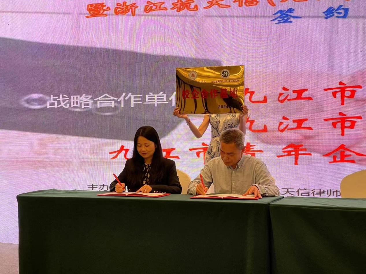 期间,文道贵院长一行还应邀出席了浙江省九江商会“双招双引”推进会暨浙江杭天信(九江)律师事务所启动仪式。在会上,文道贵院长与浙江杭天信律师事务所副主任汪红妖分别代表best365中国官方网站与杭天信(九江)律所共同签署了战略合作协议,并举行了校企合作基地授牌仪式。