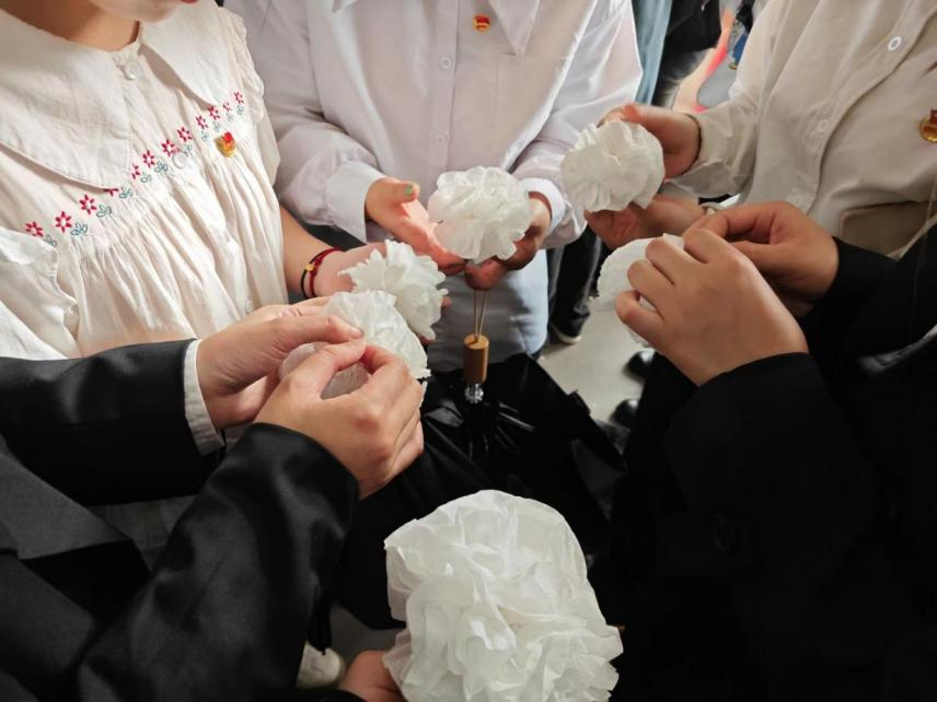 在陈列馆尾厅,成员们亲自制作的小白花层层叠叠,承载着对革命先烈最深厚的敬仰。怀着崇敬又沉重的心情,成员们将小白花献给革命先烈们,并深深地鞠躬,这不仅仅是晚辈对先人的哀思,更是让我们涵养感恩之心,深感今日幸福来之不易。