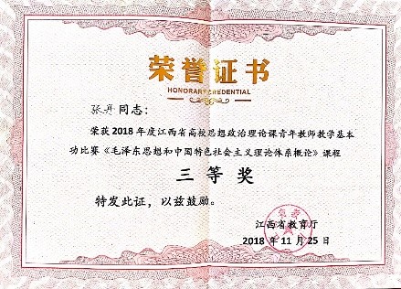 她坚持学习党的政治理论,积极学习学科相关研究成果,以用于改进教学育人工作,提升高自身理论素养和教育教学水平。她两次参加江西省哲学社会科学骨干教师研修,多次参加校内外学科相关培训及教学教研技能训练。