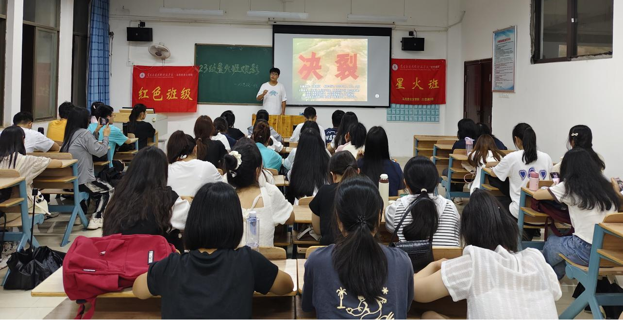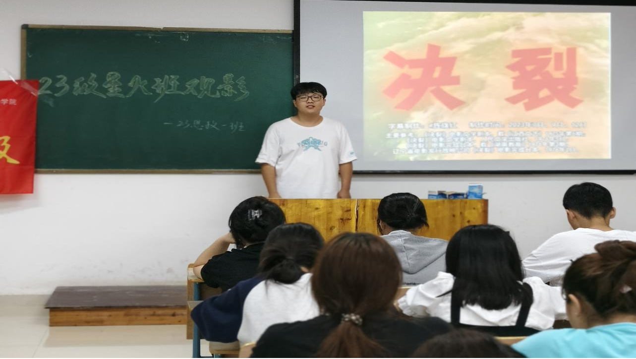 为传承红色基因,激发青春力量,best365中国官方网站23级思政1班“星火班”于5月21日晚上19:00,举办了一场红色班级观影活动。通过观看历史经典影片——《决裂》,带领同学们重温红色历史。