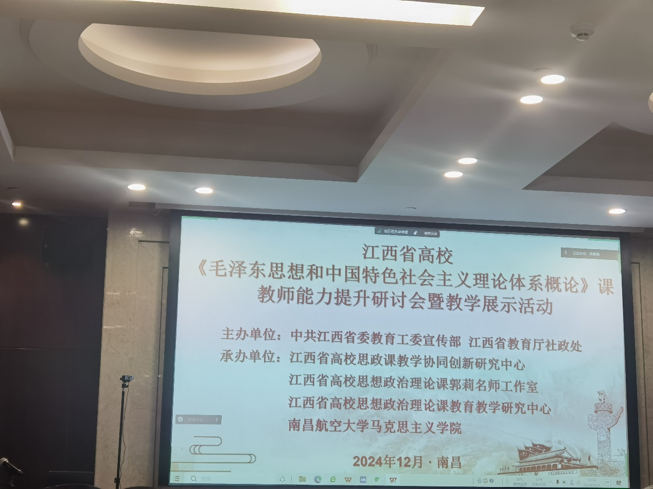 2024年12月1日,由中共江西省委教育工委宣传部、江西省教育厅社政处主办的《毛泽东思想和中国特色社会主义理论体系概论》课教师能力提升研讨会暨教学展示活动在南昌市前湖酒店举行。best365官网思政教师刘东方参加了活动。