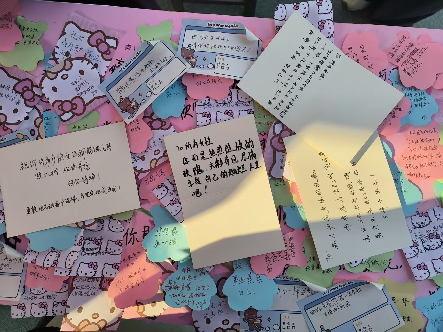 活动现场,色彩斑斓的马克笔整齐排列着。随着同学们的热情涌入,他们迅速汇聚在以庆祝三八妇女节为主题的海报周围,用纸笔将心底对女性的无限崇敬与美好祝愿一一记录。同学们或沉思、或奋笔疾书,有的为远方牵挂的母亲送上温馨的思念,有的为身边的女性朋友写下真挚的友谊赞歌,还有的则是将这份特别的礼物赠予自己,以文字记录自我鼓励与成长的足迹。整个现场弥漫着温馨、积极而又充满力量的氛围,成为了这个特别日子里一道亮丽的风景线。