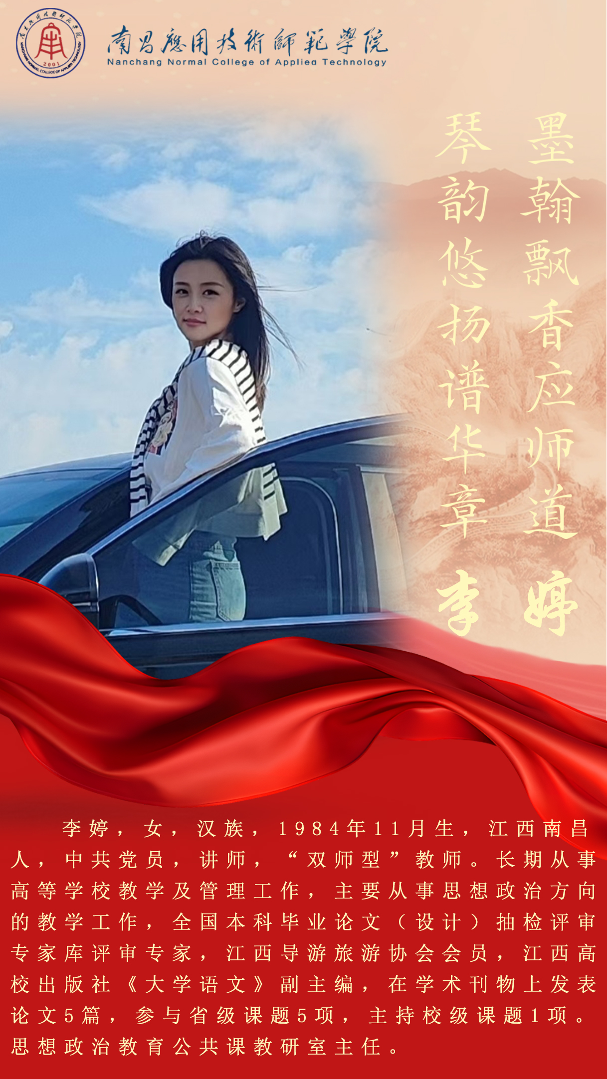 先进典型 优秀毕业生 优秀在校生 优秀教职工 您现在的位置是:首页 > 先进典型 > 优秀教职工 李婷 思想政治教育公共课系主任 管理员2025-06-092043 上一篇 杨志明 习近平新时代中国特色社会主义思想概论系主任 下一篇 龚三妹 法学系主任