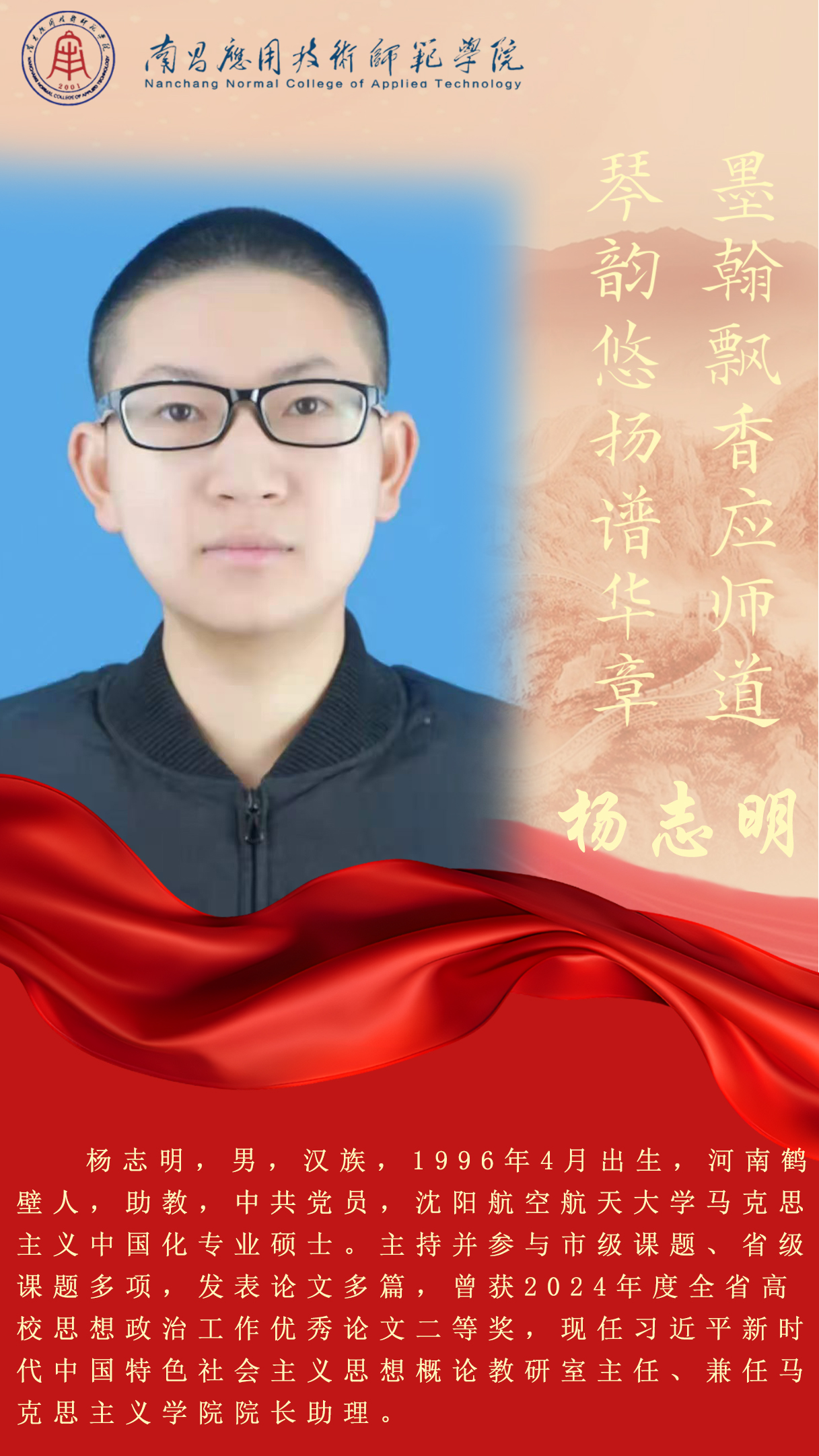 先进典型 优秀毕业生 优秀在校生 优秀教职工 您现在的位置是:首页 > 先进典型 > 优秀教职工 杨志明 习近平新时代中国特色社会主义思想概论系主任 管理员2025-06-091989 下一篇 李婷 思想政治教育公共课系主任