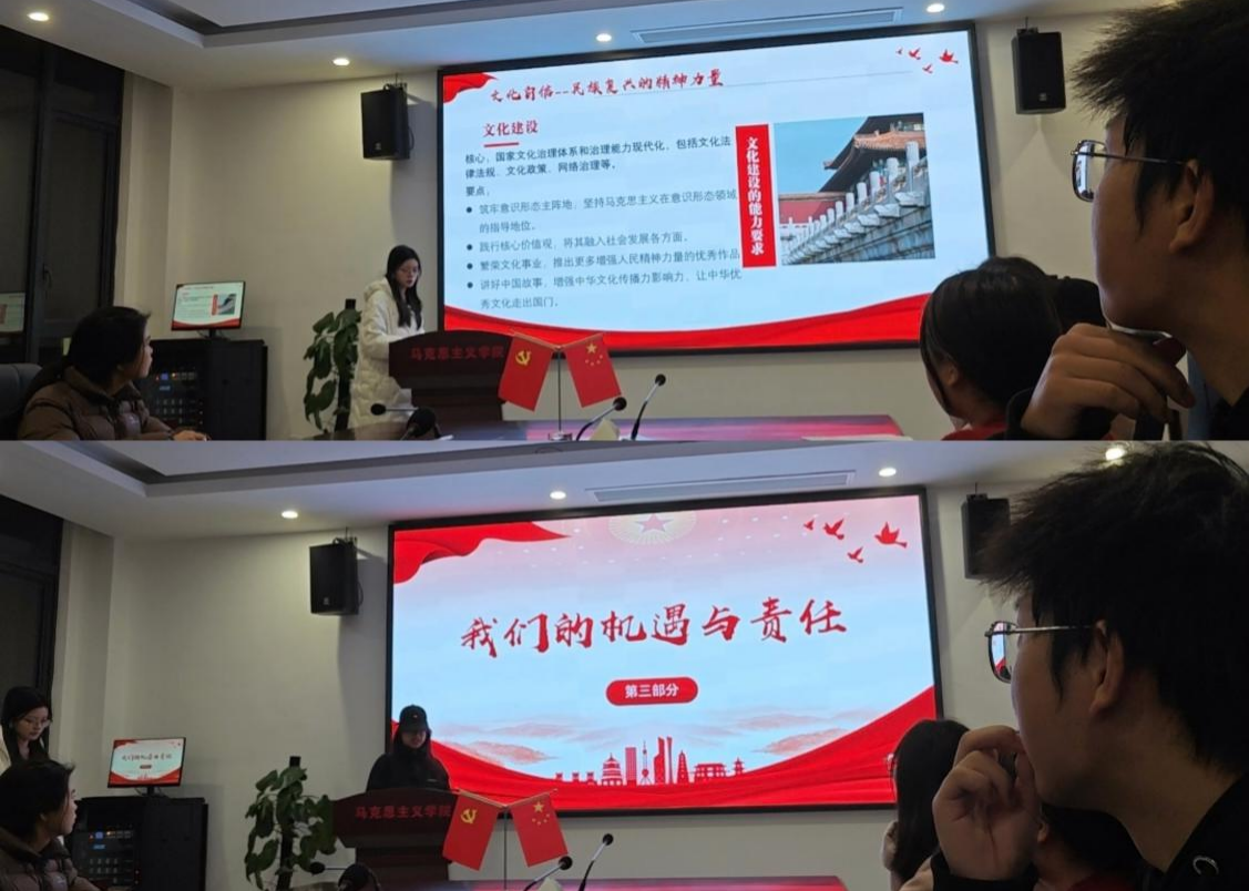宣讲现场,成员们紧扣全会精神核心要义,从不同维度展开精彩解读。肖慧洁聚焦“民生福祉”关键词,将国家治理现代化的宏观蓝图与大学生关切的就业扶持、社保保障等现实议题紧密相连,用通俗语言阐释政策温度,让青年学子真切感受到“国之大者”与个人发展的同频共振。周颖则以“文化自信”为切入点,深挖全会精神中的文化传承与创新内涵,勉励同学们在时代浪潮中厚植文化根基、勇担传播使命,让青春才华在文化强国建设中绽放光彩。