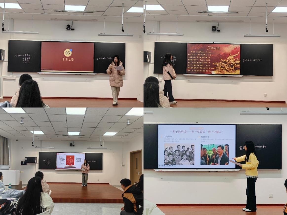 主题分享环节中,四位同学依托精心制作的PPT,带来了一场场生动深刻的红色宣讲。朱芙玉同学以“井冈山:星火燎原的革命圣地”为题,深入阐释井冈山精神的核心内涵与时代价值;吴雨桐同学聚焦“恽代英的生平与光辉事迹”,深情讲述革命先辈为信仰献身的热血征程;彭欢同学回溯“共青城垦荒的故事”,再现一代青年扎根荒原、艰苦创业的奋斗史诗;汪纤文同学则以“倪新华与共青的坚守”为切入点,刻画了平凡岗位上坚守初心、践行使命的动人图景。